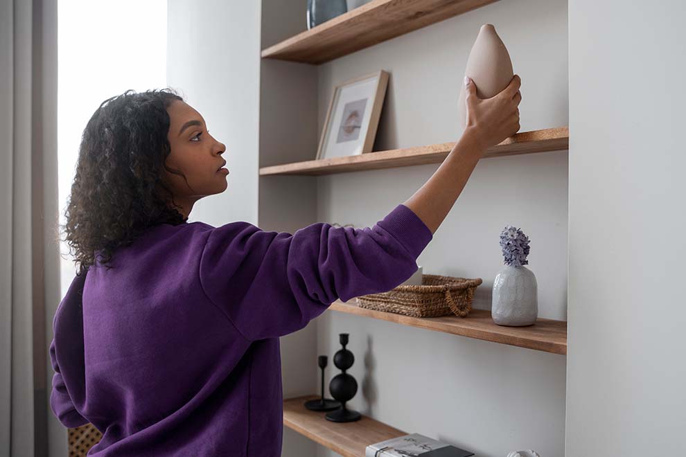 Se o chão já está ocupado, olhe para cima! Prateleiras são ótimas para liberar espaço e ainda enfeitar o ambiente. Use-as para livros, coleções, objetos decorativos, plantas ou até caixas organizadoras mais estilosas.